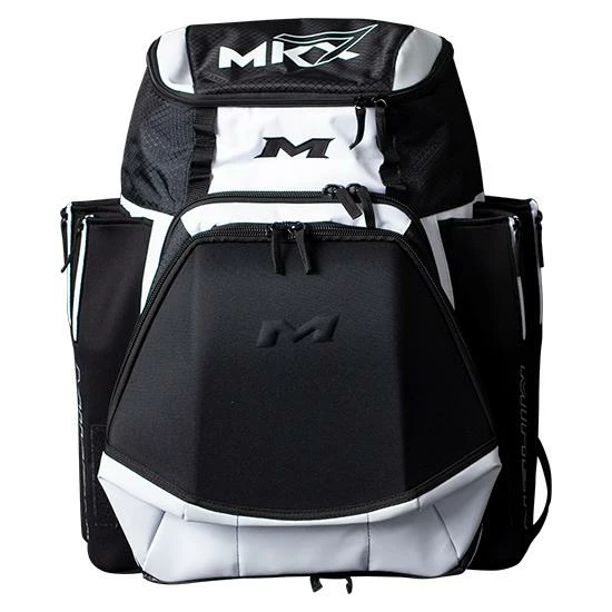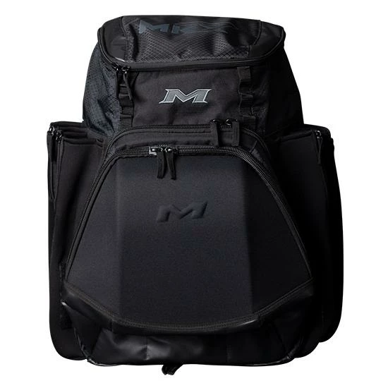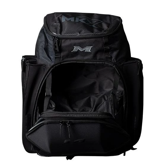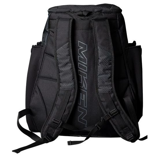 The all new Miken XL Backpack features: 4 zippered neoprene bat sleeves, a durable “J” style fence hook, 2 fleece lined pockets in top valet tray (for phone, accessories, etc), Glove storage, Molded front pocket that converts to shelf, Easy to clean tarpaulin bottom, and a Daisy chain for external batting glove storage.